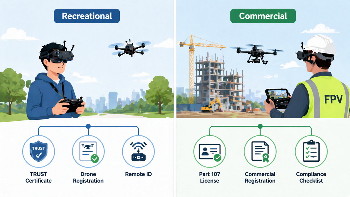 In this guide, I'll walk you through recreational vs commercial FPV drone rules, TRUST, Part 107, drone registration, and ham radio licenses, using real‑world scenarios from FPV flying and FPV drone motor projects. [jrupprechtlaw]